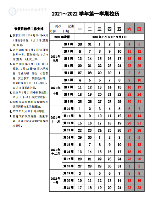 2021~2022学年第一学期校历