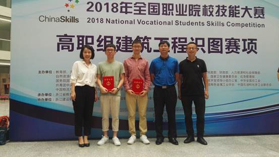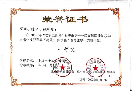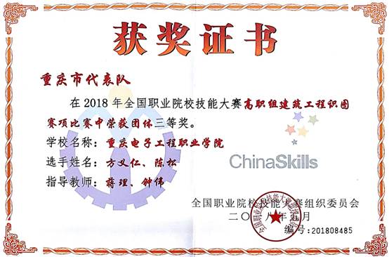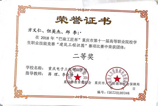 2018年获得重庆市第十一届高等职业院校学生职业技能竞赛“建筑工程识图”赛项团体一等奖和二等奖以及全国职业院校技能大赛高职组“建筑工程识图”赛项团体三等奖。