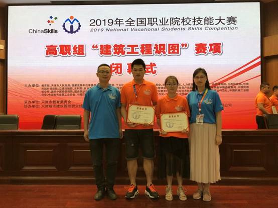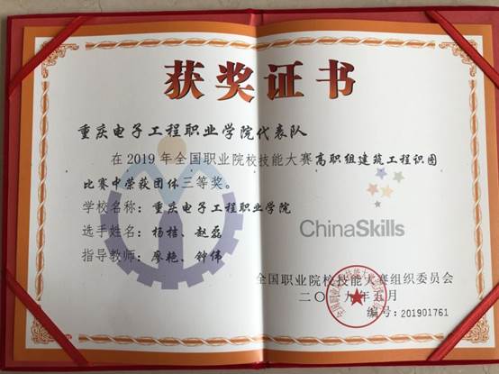 2019年获得“巴渝工匠”杯重庆市第十二届高等职业院校学生职业技能竞赛“建筑工程识图”赛项一等奖和二等奖以及全国职业院校技能大赛高职组“建筑工程识图”赛项团体三等奖。