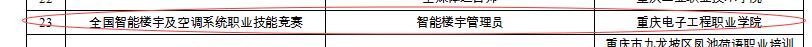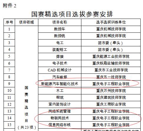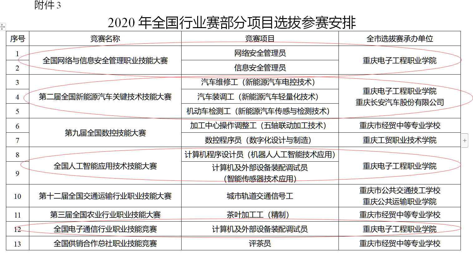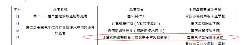 根据《重庆市人力资源和社会保障局办公室关于做好中华人民共和国第一届职业技能大赛等国家级赛事备战参赛工作的通知》渝人社办〔2020〕222号,我校获得新能源汽车智能化技术、网络系统管理、物联网技术、信息网络布线等4个国赛精选项目的选手选拔训练单位;网络安全管理员、信息安全管理员、汽车维修工(新能源汽车电控技术)、汽车装调工(新能源汽车轻量化技术)、机动车检测工(新能源汽车传感与检测技术)、计算机程序设计员(机器人人工智能技术应用)、计算机及外部设备装配调试员(智能传感器技术应用)、计算机及外部设备装配调试员、计算机网络管理员(信息安全与数据恢复)和智能楼宇管理员等10个2020年全国行业赛项目重庆市选拔参赛承办单位。