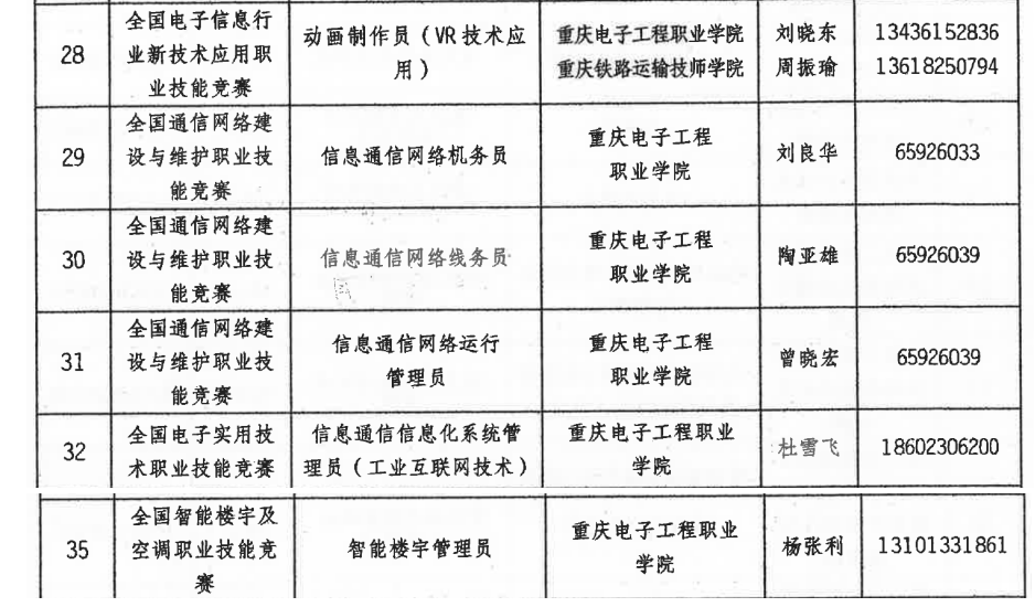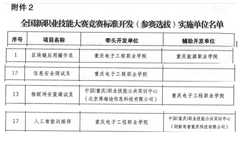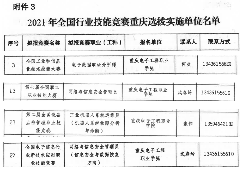 近日,重庆市人力资源和社会保障局发布了《关于做好2021年国家级有关赛事备战参赛工作的通知》,我校获批“全国新职业技能大赛竞赛标准开放(参赛选拨)”4个赛项实施单位立项,“2021年全国行业技能竞赛重庆选拨”10个赛项实施单位立项(详见附件),共计获批承办14个国赛重庆选拨赛赛项。我校将按照文件要求积极开展相应工作,完成相应赛项承办。