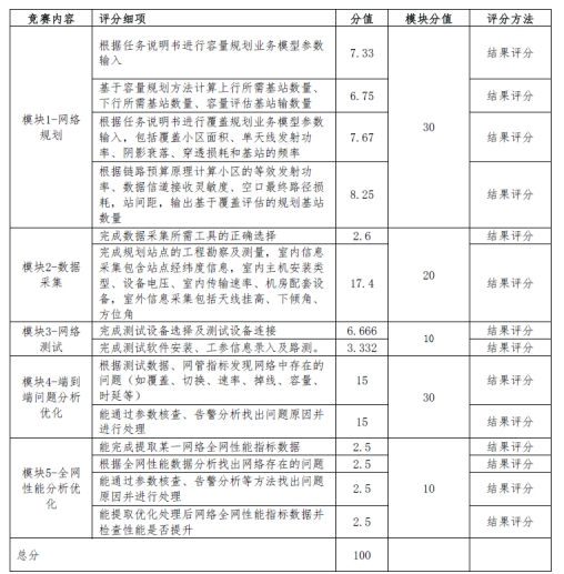 本赛项通过理论和实操两个任务模块的考核,达到评价选手信息通信网络运行管理方面综合职业能力的目的,以国家职业技能标准《信息通信网络运行管理员》职业资格要求为标准,以5G网络基本原理、5G关键技术、协议、信令流程等为基础,通过网络规划、网络测试分析、网络质量评估、端到端问题分析、全网性能提升5个任务模块,考核选手在网络规划、性能指标分析、网络优化、故障处理等方面的技术知识与应用技能。