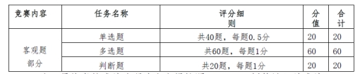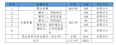 教职工组以《信息通信网络运行管理员》中级(国家职业资格四级)的要求为基础开展命题;学生组以《信息通信网络运行管理员》初级工(国家职业资格五级)的要求为基础开展命题。同时,各赛项项目命题在上述要求基础上,借鉴世界技能大赛命题方法和考核内容,适当增加相关新知识、新技术、新设备、新技能等内容。具体试题见样题。