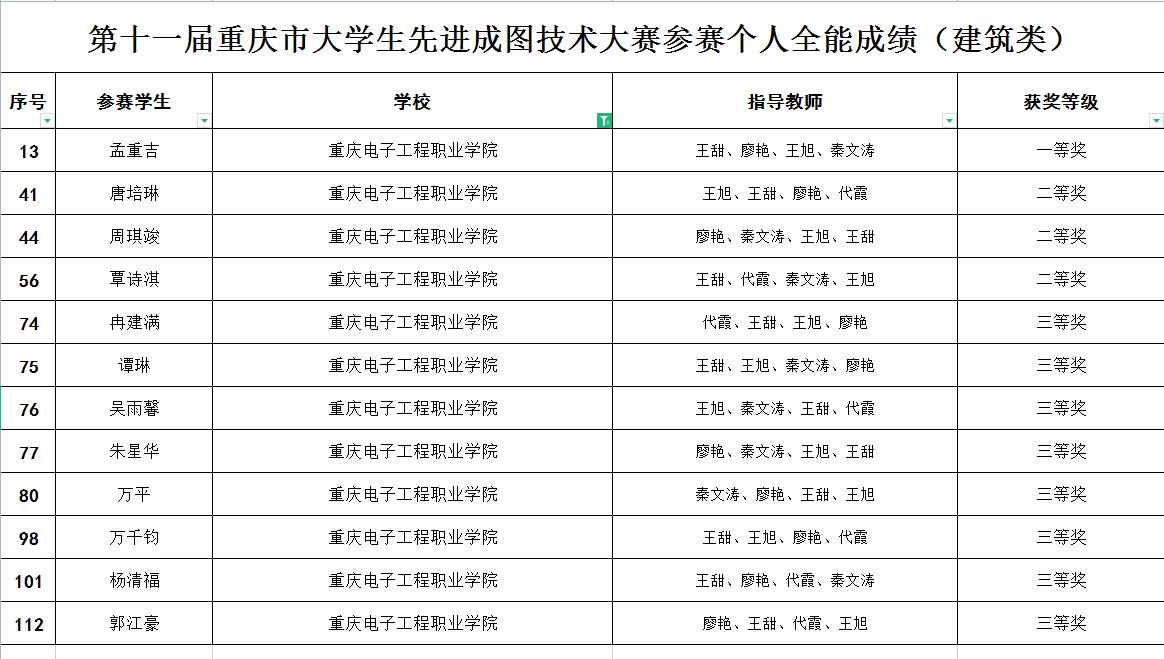 接重庆市教育委员会8月31日《关于2022年第十一届重庆市大学生先进成图技术大赛获奖情况的通报》(渝教高函〔2022〕53号),根据《重庆市教育委员会关于公布2022年市级普通本科高校大学生学科竞赛项目的通知》,第十一届重庆市大学生先进成图技术大赛于2022年5月28日举行,共有23所高校的104支队伍、733名学生参加本次竞赛活动。经专家评审,共评出团体一等奖20项、二等奖32项、三等奖31项、个人全能一等奖74项、二等奖146项、三等奖220项。