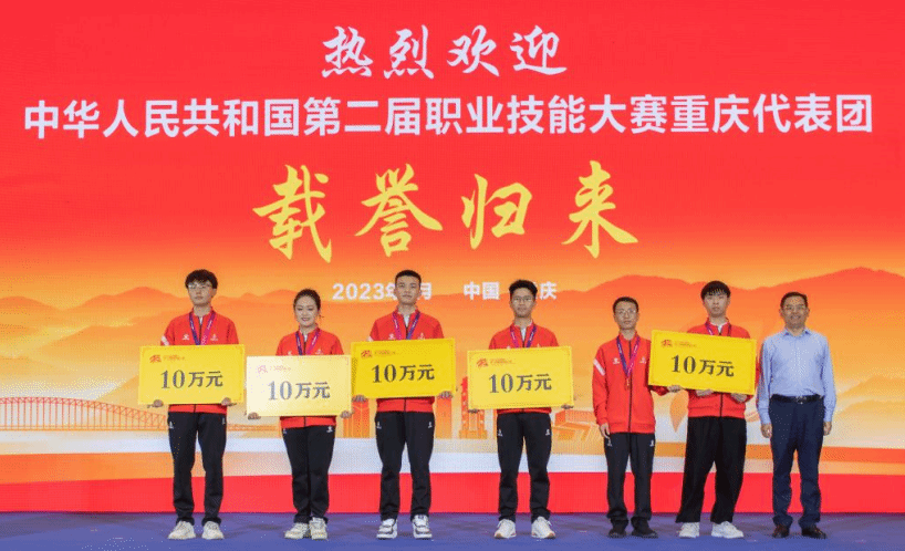 重庆市人力资源与社会保障局领导在祝贺重庆代表团载誉归来的同时,特别提出表扬了我校近年在世界技能大赛和中华人民共和国职业技能大赛中取得的优异成绩:在2020年中华人民共和国第一届职业技能大赛荣获一金一银,2022年世界技能大赛特别赛荣获金牌,本次中华人民共和国第二届职业技能大赛又荣获两金。充分肯定了我校在为重庆市区域人才培养上做成的巨大贡献和取得的突出成绩!大会现场重庆市人力资源与社会保障局领导还为获奖选手颁发了现金奖励!