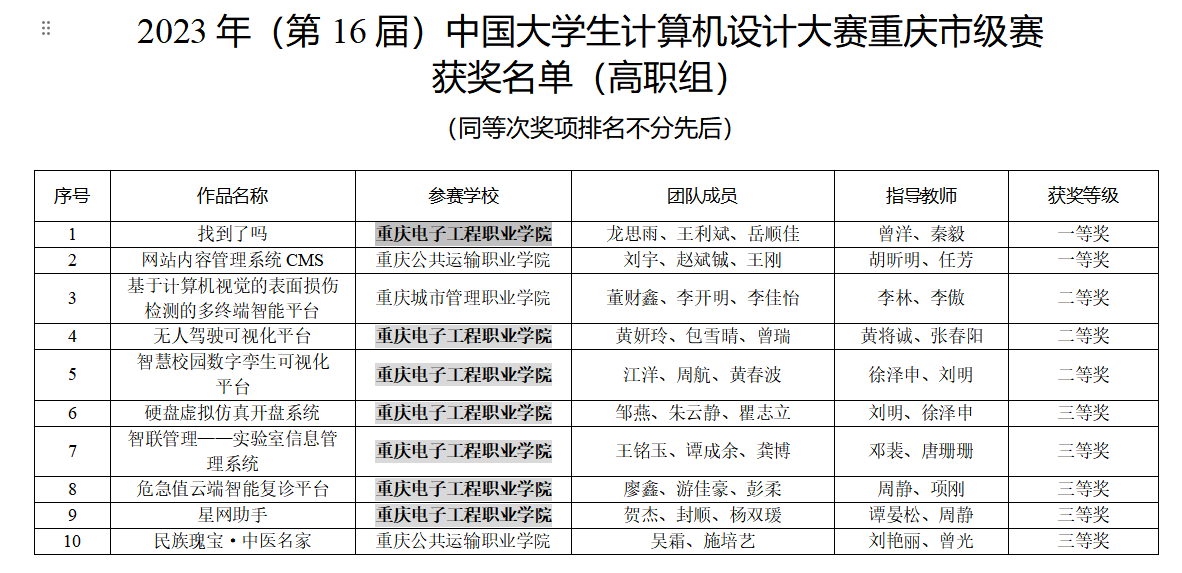 近期,重庆市教育委员会对2023年(第16届)中国大学生计算机设计大赛重庆市级赛获奖情况正式通报。高职组共有10支队伍获奖,我校共获奖7个奖项,其中一等奖1个、 二等奖2个 、三等奖4个。