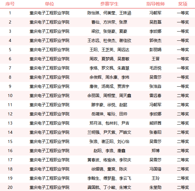 2023年12月15日,重庆市教育委员会对2023年2023高教社杯全国大学生数学建模竞赛(重庆赛区)获奖情况进行通报。共有来自全市52所学校的1838支队伍参加(其中本科组1421支队伍、高职组417支队伍)。我校参赛队获得一等奖9个、 二等奖11个 。