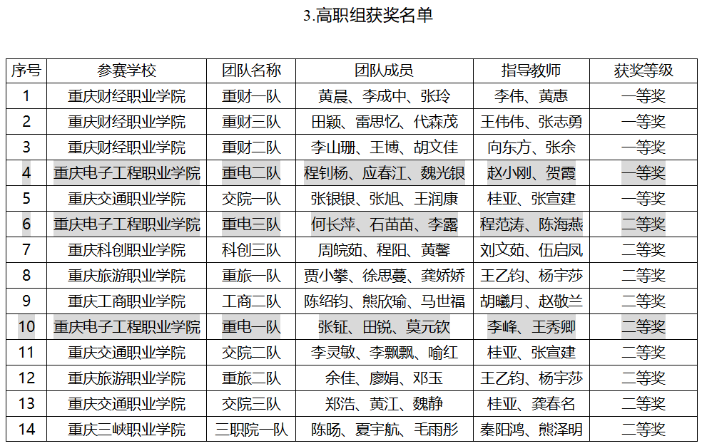 2023年12月20日,重庆市教育委员会对2023年重庆市大学生企业财务大数据智能决策竞赛获奖情况进行通报。本次竞赛内容包括企业财务大数据采集处理与分析和企业财务大数据智能决策分析两个部分。主要考核学生的财务数据分析和决策分析的能力。共有来自全市36所学校的97支队伍参加(其中本科组45支队伍、高职组52支队伍)。我校参赛队获得一等奖1个、二等奖2个 。