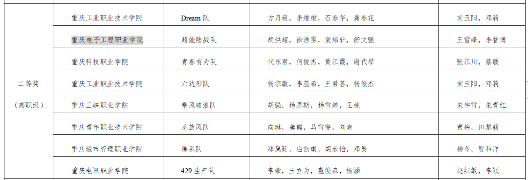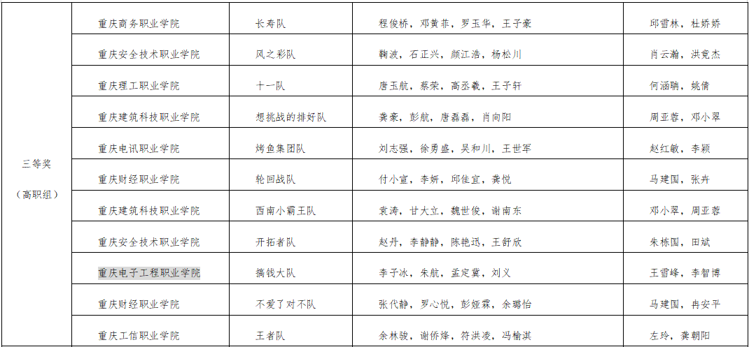 2023年12月20日,重庆市教育委员会对2023重庆市大学生供应链设计大赛获奖情况进行通报。本次竞赛共有来自全市40所学校的78支队伍参加(其中本科组40支队伍、高职组38支队伍)。我校参赛队获得二等奖1个、 三等奖1个 。