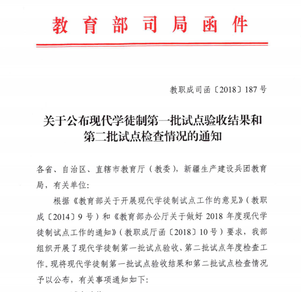 根据教育部《关于公布现代学徒制第一批试点验收结果和第二批试点检查情况的通知》(教职成司函〔2018〕187号),我校作为国家第一批现代学徒制试点单位顺利通过教育部验收。