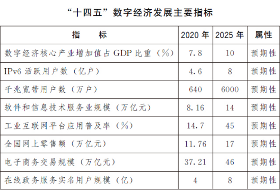 到2025年,数字经济迈向全面扩展期,数字经济核心产业增加值占GDP比重达到10%,数字化创新引领发展能力大幅提升,智能化水平明显增强,数字技术与实体经济融合取得显著成效,数字经济治理体系更加完善,我国数字经济竞争力和影响力稳步提升。