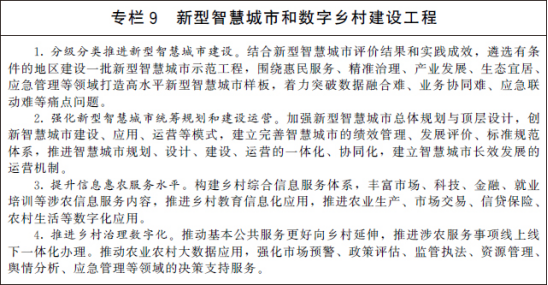 (三)推动数字城乡融合发展。统筹推动新型智慧城市和数字乡村建设,协同优化城乡公共服务。深化新型智慧城市建设,推动城市数据整合共享和业务协同,提升城市综合管理服务能力,完善城市信息模型平台和运行管理服务平台,因地制宜构建数字孪生城市。加快城市智能设施向乡村延伸覆盖,完善农村地区信息化服务供给,推进城乡要素双向自由流动,合理配置公共资源,形成以城带乡、共建共享的数字城乡融合发展格局。构建城乡常住人口动态统计发布机制,利用数字化手段助力提升城乡基本公共服务水平。