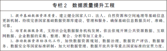 (一)强化高质量数据要素供给。支持市场主体依法合规开展数据采集,聚焦数据的标注、清洗、脱敏、脱密、聚合、分析等环节,提升数据资源处理能力,培育壮大数据服务产业。推动数据资源标准体系建设,提升数据管理水平和数据质量,探索面向业务应用的共享、交换、协作和开放。加快推动各领域通信协议兼容统一,打破技术和协议壁垒,努力实现互通互操作,形成完整贯通的数据链。推动数据分类分级管理,强化数据安全风险评估、监测预警和应急处置。深化政务数据跨层级、跨地域、跨部门有序共享。建立健全国家公共数据资源体系,统筹公共数据资源开发利用,推动基础公共数据安全有序开放,构建统一的国家公共数据开放平台和开发利用端口,提升公共数据开放水平,释放数据红利。