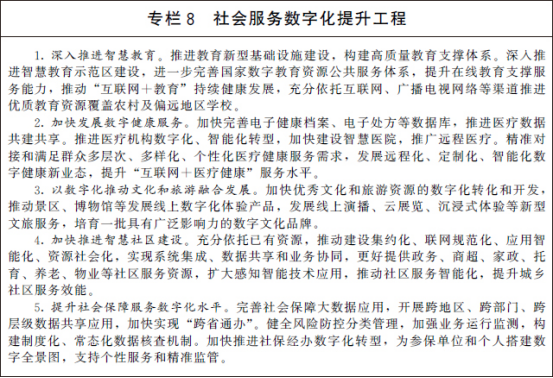——数字化公共服务更加普惠均等。数字基础设施广泛融入生产生活,对政务服务、公共服务、民生保障、社会治理的支撑作用进一步凸显。数字营商环境更加优化,电子政务服务水平进一步提升,网络化、数字化、智慧化的利企便民服务体系不断完善,数字鸿沟加速弥合。
