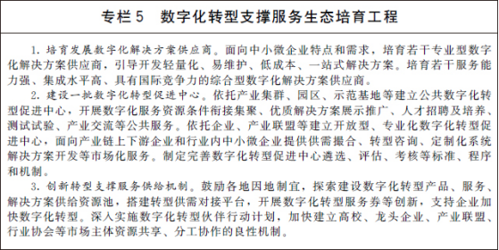 (一)加快企业数字化转型升级。引导企业强化数字化思维,提升员工数字技能和数据管理能力,全面系统推动企业研发设计、生产加工、经营管理、销售服务等业务数字化转型。支持有条件的大型企业打造一体化数字平台,全面整合企业内部信息系统,强化全流程数据贯通,加快全价值链业务协同,形成数据驱动的智能决策能力,提升企业整体运行效率和产业链上下游协同效率。实施中小企业数字化赋能专项行动,支持中小企业从数字化转型需求迫切的环节入手,加快推进线上营销、远程协作、数字化办公、智能生产线等应用,由点及面向全业务全流程数字化转型延伸拓展。鼓励和支持互联网平台、行业龙头企业等立足自身优势,开放数字化资源和能力,帮助传统企业和中小企业实现数字化转型。推行普惠性“上云用数赋智”服务,推动企业上云、上平台,降低技术和资金壁垒,加快企业数字化转型。