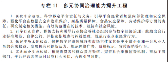 (三)完善多元共治新格局。建立完善政府、平台、企业、行业组织和社会公众多元参与、有效协同的数字经济治理新格局,形成治理合力,鼓励良性竞争,维护公平有效市场。加快健全市场准入制度、公平竞争审查机制,完善数字经济公平竞争监管制度,预防和制止滥用行政权力排除限制竞争。进一步明确平台企业主体责任和义务,推进行业服务标准建设和行业自律,保护平台从业人员和消费者合法权益。开展社会监督、媒体监督、公众监督,培育多元治理、协调发展新生态。鼓励建立争议在线解决机制和渠道,制定并公示争议解决规则。引导社会各界积极参与推动数字经济治理,加强和改进反垄断执法,畅通多元主体诉求表达、权益保障渠道,及时化解矛盾纠纷,维护公众利益和社会稳定。