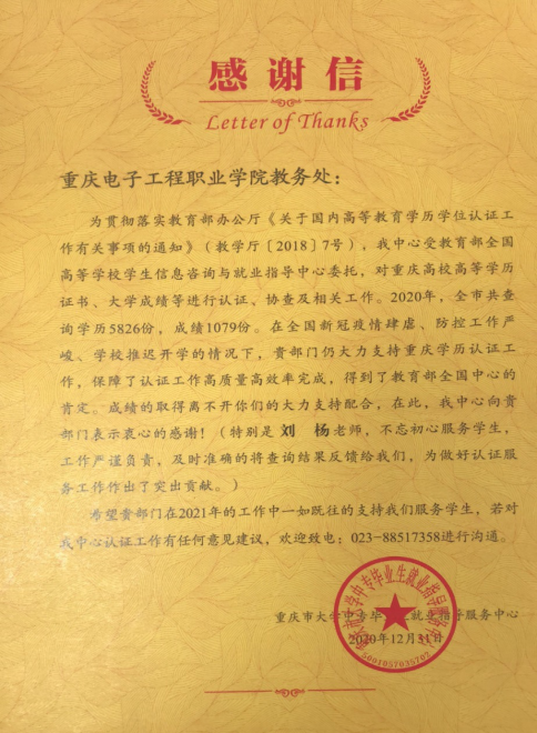 特别提出,在全国新冠疫情肆虐、防控工作严峻、学校推迟开学的情况下,教务处仍然积极配合工作,认真核实网上申请认证的学历及成绩工作。重庆市大中专毕业生就业指导服务中心就教务处高质量高效率的完成表示了感谢。感谢信中对刘杨老师秉持不忘初心、服务学生的原则,认真严谨负责的工作态度提出表扬。