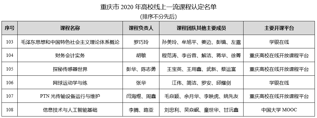 重庆市2020年高校线上一流课程评审认定结果已公布,全市本次认定线上一流课程162门,其中,我校《毛泽东思想和中国特色社会主义理论体系概论》《财务会计实务》《探秘传感器世界》《网球运动学与练》《PTN光传输设备运行与维护》《信息技术与人工智能基础》6门课程通过“重庆市2020年高校线上一流课程”认定。