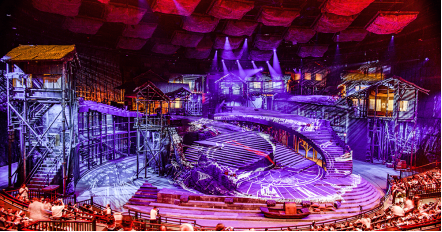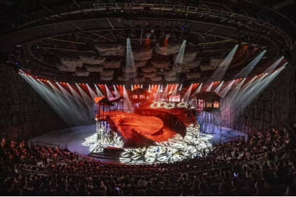 《重庆·1949》采用独创的多维立体沉浸式室内旋转舞台,其舞台机械结构之复杂、创意构思之精妙,让人叹为观止。整部剧目表演、舞台极具震撼力,不少观众表示当舞台旋转起来,似乎穿越回了1949年,当一声枪响,一段段历史从眼前划过。吊脚楼建筑群、石阶与牌坊巨轮