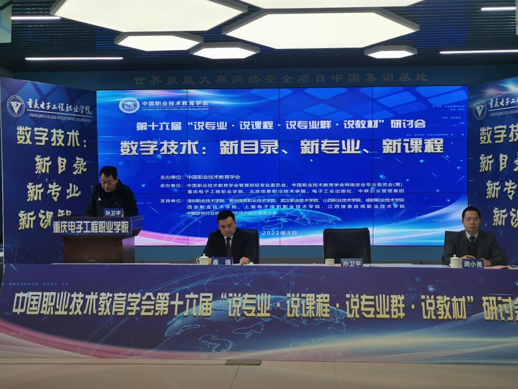 3月25-26日,我校承办中国职业技术教育学会第十六届“说专业·说课程·说专业群·说教材”研讨会。本次研讨会通过线上、线下相结合的方式进行。中国职业技术教育学会会长、教育部原副部长鲁昕,教育部职成司副司长谢俐,教育部教师工作司副司长宋磊,中国职业技术教育学会学术委员会顾问、中国科学院院士、西北工业大学柔性电子前沿科学中心首席科学家黄维,重庆市教育委员会一级巡视员邓沁泉,工业和信息化部人才交流中心党委书记、主任李学林,学会常务副会长、智慧财经专业委员会主任史薇,学会副会长、《国家职业分类大典》修订专家委员会首席专家、人力资源和社会保障部中国就业培训技术指导中心原党委书记陈李翔,中国职业技术教育学会科技成果转化工作委员会副主任兼秘书长、中国科学院计算技术研究所研究员田霖,重庆市教育委员会职成处处长吴岚等领导和专家与会。会议先后由校党委副书记、校长聂强教授,党委副书记龚小勇教授主持。