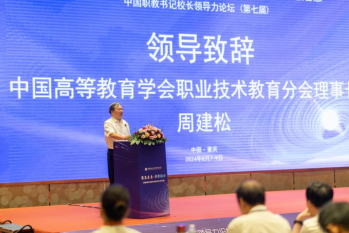 随后,中国高等教育学会职业技术教育分会理事长周建松发表致辞。他强调了职教智慧与领导力的重要性,回顾了论坛的发展历程,并呼吁持续创新,将论坛打造成为职业教育的知名品牌。周建松理事长对职业教育的未来充满信心,并期待与会者共同探索新思路、新方法,为构建适应新时代需求的现代职业教育体系贡献力量。
