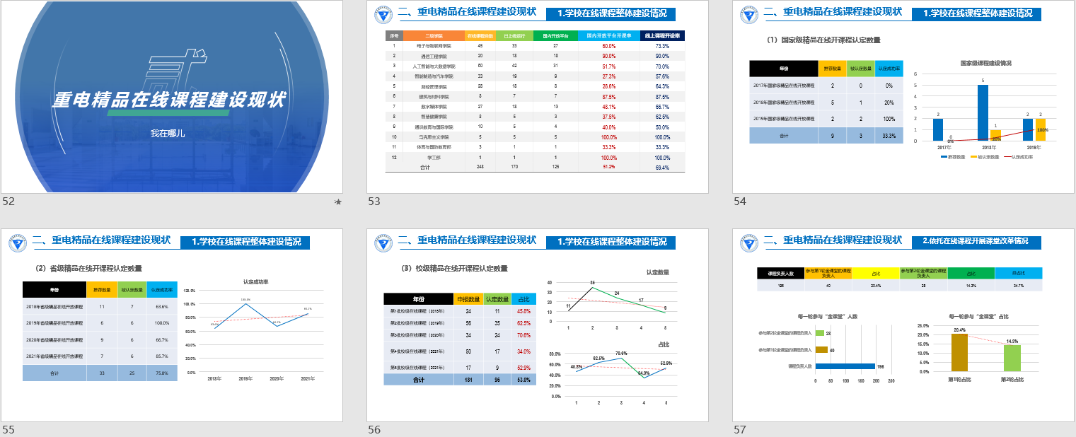 其次,分析了重电在线课程建设的现状。对我校在线课程的线上开设率、国内开放平台开课率、国家级在线课程申报成功率、省级在线课程认定通过率、各二级学院校级在线课程占比等整体建设情况进行了数据分析,还对依托在线课程开展课堂教学改革的情况进行了剖析,如:课程负责人参与“金课堂”建设或教学能力比赛的人数占比,同时,指出了校级在线开放课程建设中存在的突出问题。