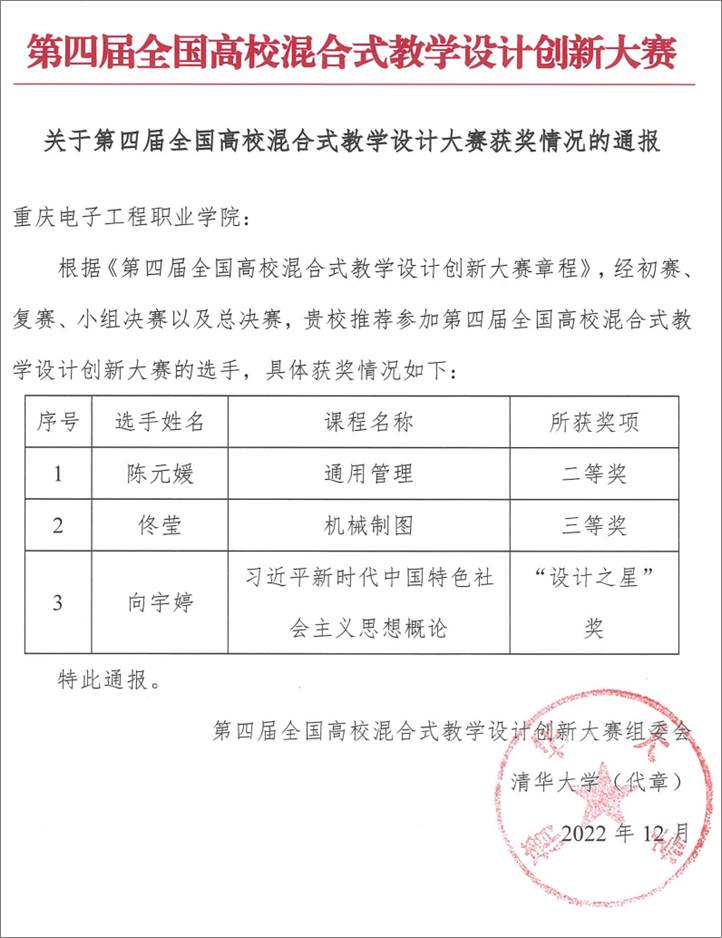 日前,由清华大学主办的“第四届全国高校混合式教学设计创新大赛”落下帷幕,全国336所高校(含高职院校32所)和764名选手同场竞技,共评出特等奖5名、一等奖20名、二等奖30名、三等奖60名、“设计之星”奖267名、优胜奖382名。我校推荐的3位教师凭借出色表现,从校级初赛、省级复赛、全国小组决赛、全国总决赛中脱颖而出,取得了我校初次参加该项赛事的好成绩:财经管理学院陈元媛团队以“通用管理”为参赛课程,荣获全国二等奖;智能制造与汽车学院佟莹团队以“机械制图”为参赛课程,荣获全国三等奖,马克思主义学院向宇婷团队荣获设计之星奖。