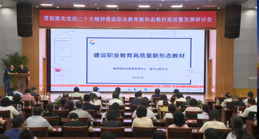 教育部职业教育发展中心曾天山副主任做了《建设职业教育高质量新形态教材》的报告。报告指出,职业院校是教材编写的主力军,岗课赛证、专业资源库和在线课程配套教材有增长,活页式、工作手册式教材有增长,数字教材是一个发展方向。